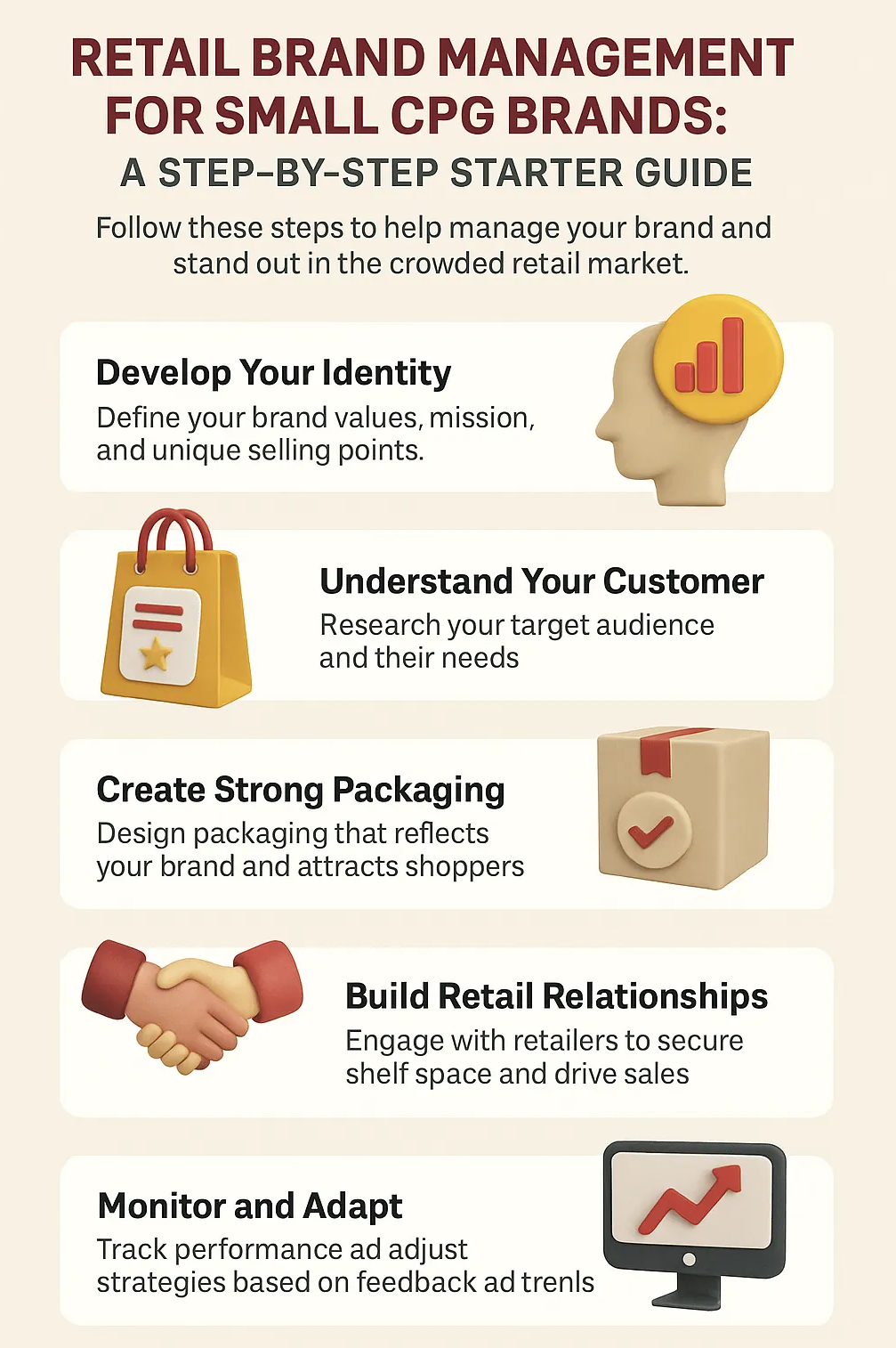 This step-by-step retail brand management guide for small CPG brands offers a practical roadmap built from real-world experience helping emerging brands grow in competitive retail environments. It goes beyond theory, sharing first-hand insights, proven strategies, and actionable examples that show how smaller teams can build recognizable, trustworthy retail brands without big-budget resources.